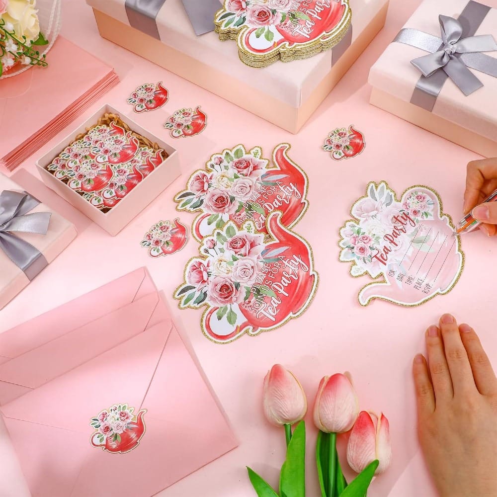 For an elegant yet playful vibe, Whalineâs tea party invitations shine with their colorful and cheerful designs. They include a menu of matching stickers for sealing envelopes, adding a fun and decorative touch to your invites. These invitations are a hit for bridal showers, birthdays, or baby showers! Check them out on Amazon.
