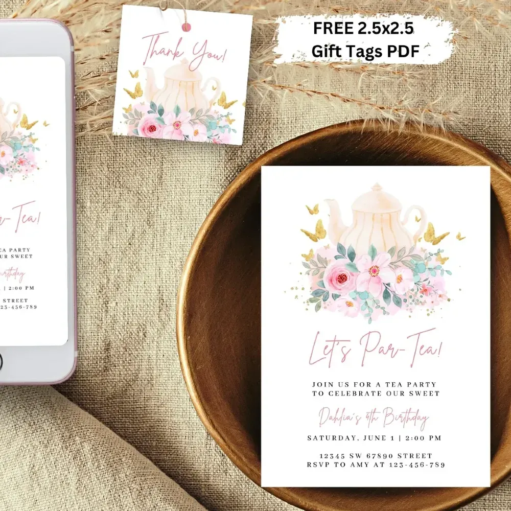 Take control by personalizing the invitation with editable tea party invitation templates. Many platforms like Etsy offer downloadable designs you can update with specific details like your name, party time, and location.
