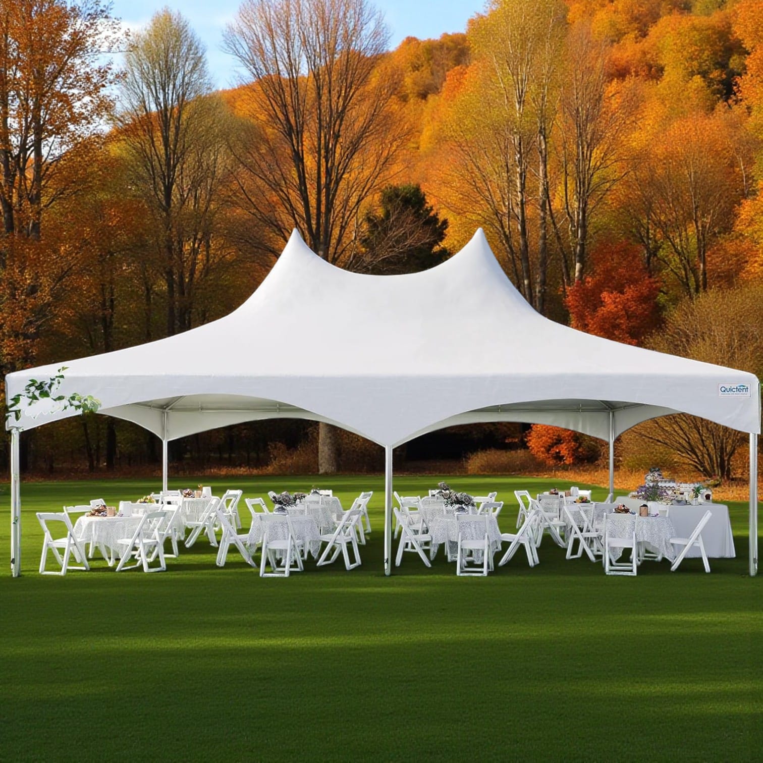High peak tents, also known as marquee tents, combine the open interior of a frame tent with the dramatic peaks of a pole tent. This modern design is achieved using a "floating" center pole that doesn't touch the ground, creating high, sweeping ceilings without obstructing the floor plan. Their unique style makes them a standout choice for designer party tents for elegant fall events.