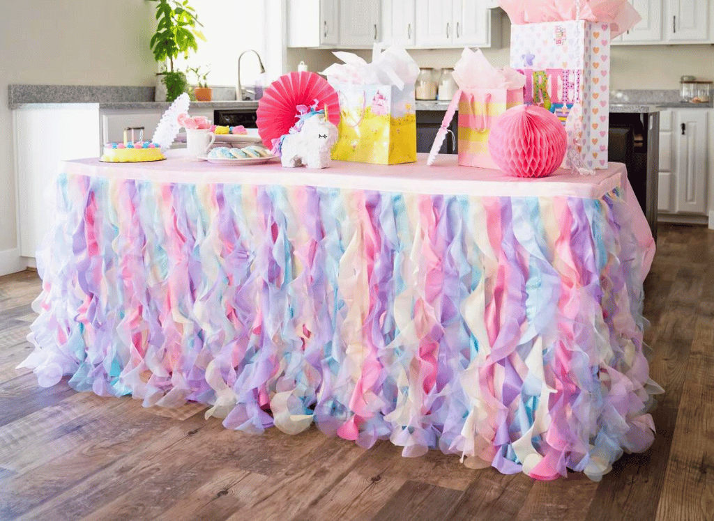 Use a rainbow tulle tutu table skirt to give your gifts table a dreamy look. Adorn it with unicorn centerpieces and sprinkle some confetti to add that extra dash of magic! ๐จโจ