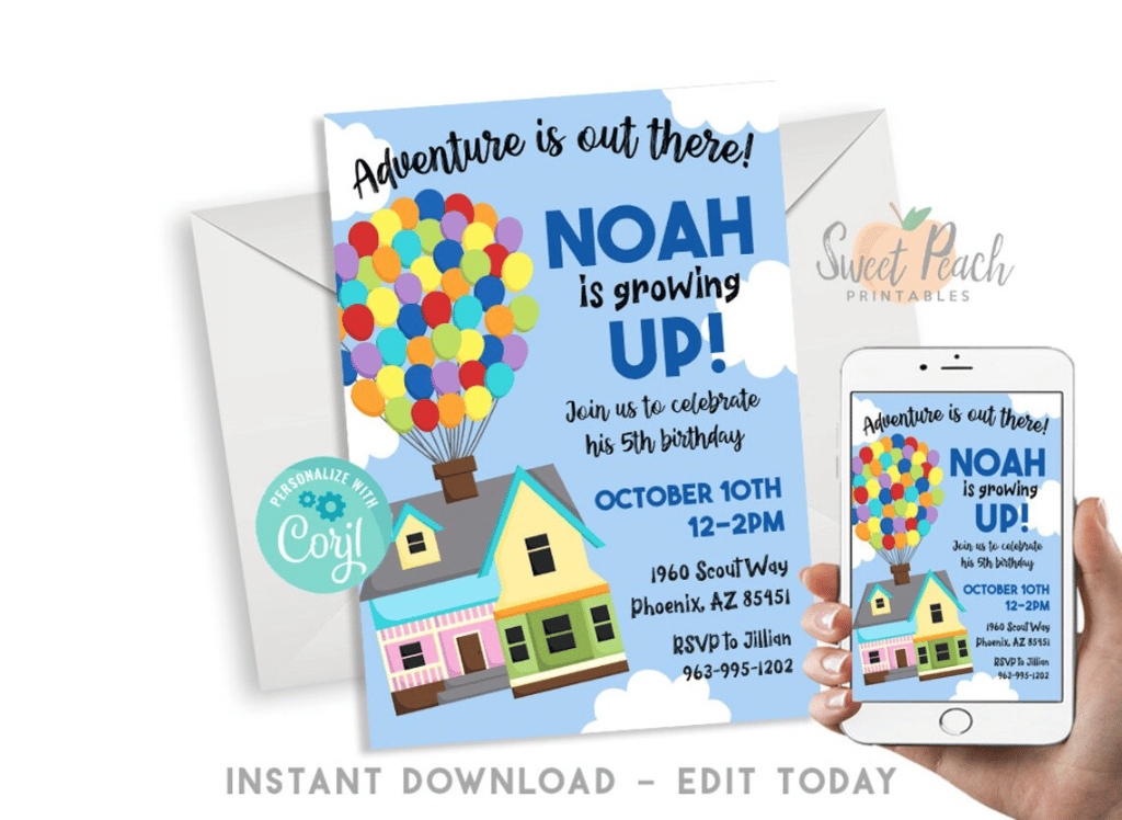 Jazz up your birthday bash with a touch of Pixar magic! Our Editable UP! Birthday Party Invite perfectly captures the whimsical spirit of the beloved movie. This 5x7 digital invitation, featuring the iconic flying balloon house, is customizable for both boys and girls. Instantly download and spread the adventure with style.