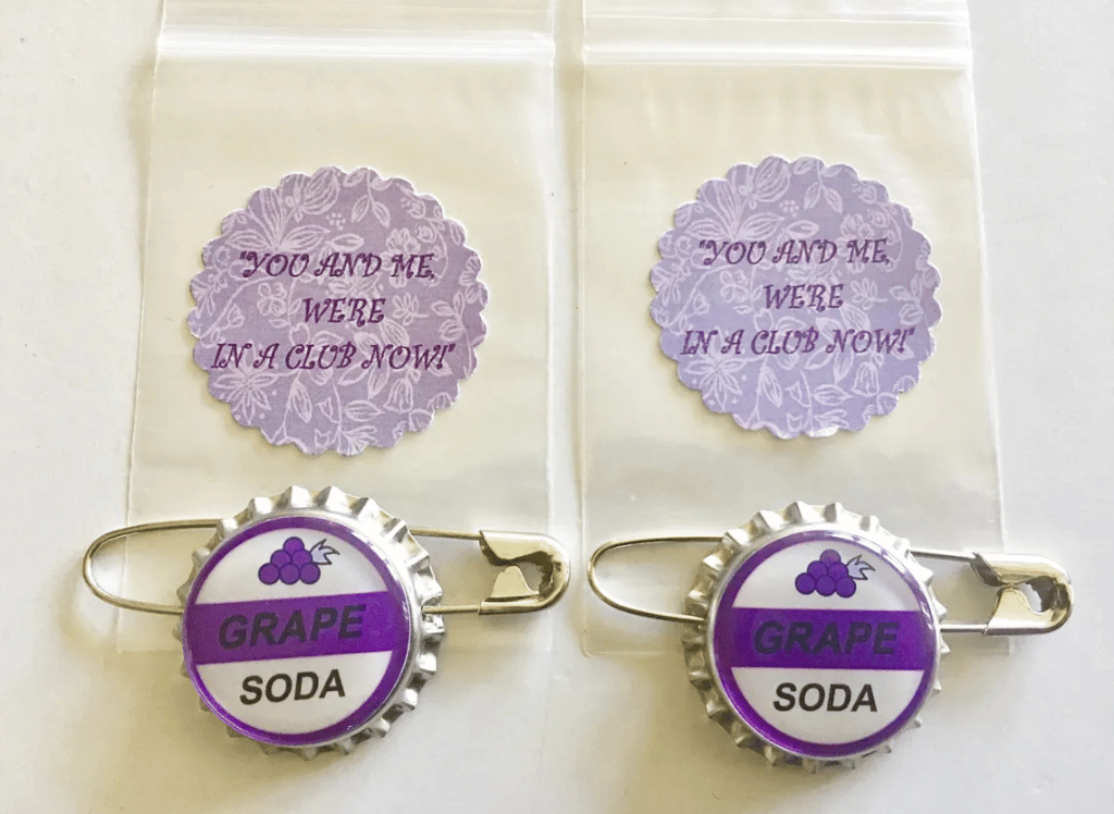 Join the adventure club with the Ellie Badges Grape Soda Pins! These charming replicas of the iconic bottle caps from the movie are perfect for engagements, weddings, or birthday parties. Each pin comes in a cute zipper bag, complete with the phrase "You and Me, We're In A Club Now." Materials include a bottle cap, an epoxy sticker, and a coil-less safety pin.