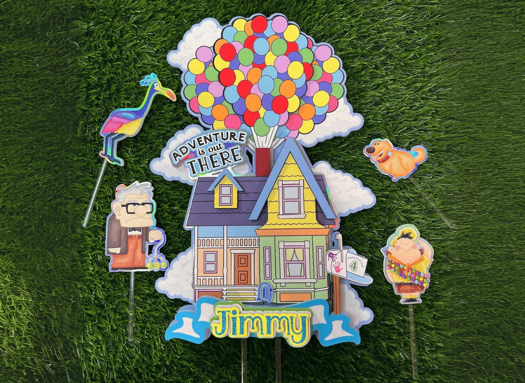 Top your sweet creations with our UP Cake Topper and watch spirits soar! Featuring the iconic house with balloons, this topper reads "Adventures out there" and can be personalized with your name. It’s the perfect finishing touch for any up-themed celebration.