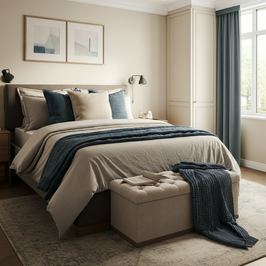 To keep surfaces clear, ensure the bedside table is large enough for personal items like a phone, a good book, and a glass of water. If the room needs to double as a workspace, consider a small desk. Otherwise, a comfortable armchair can create a cozy lounge area for reading or relaxing. Hidden storage, like a storage bench or drawers under the bed, is perfect for stowing away your own belongings to give the room an open, uncluttered feel.