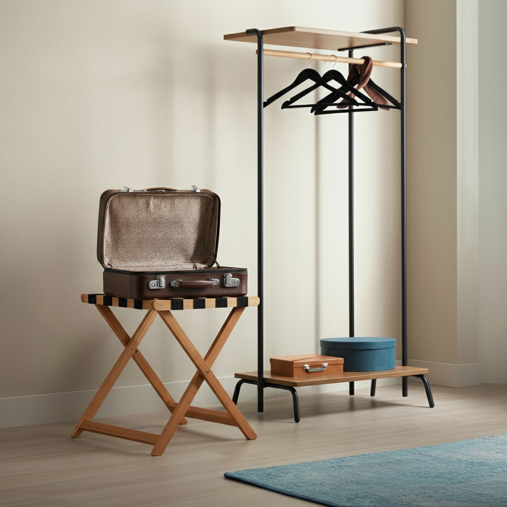 If the bedroom closet is available, clear out at least half of it and provide a set of matching hangers. If you don't have a free closet, a stylish freestanding clothing rack is an excellent alternative. It gives visitors a designated spot for dresses, suits, and coats, preventing them from ending up draped over a chair. A handsome luggage rack is another essential; it keeps suitcases off the floor, making them easier to access and preventing scuffs on your walls or furniture.