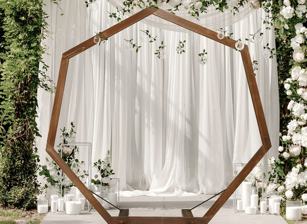 Clumpossom 7.2FT Heptagonal Stunning Backdrop Wedding Arch is the perfect backdrop for your white flowers. The arch is crafted from high-quality wood and stained with a dark wood finish, giving it an elegant and timeless look. The arch measures 7.2 FT in length and width and weighs 17.4 lb. Plus, the arch is easy to assemble and install, so you can set up the arch quickly and easily.